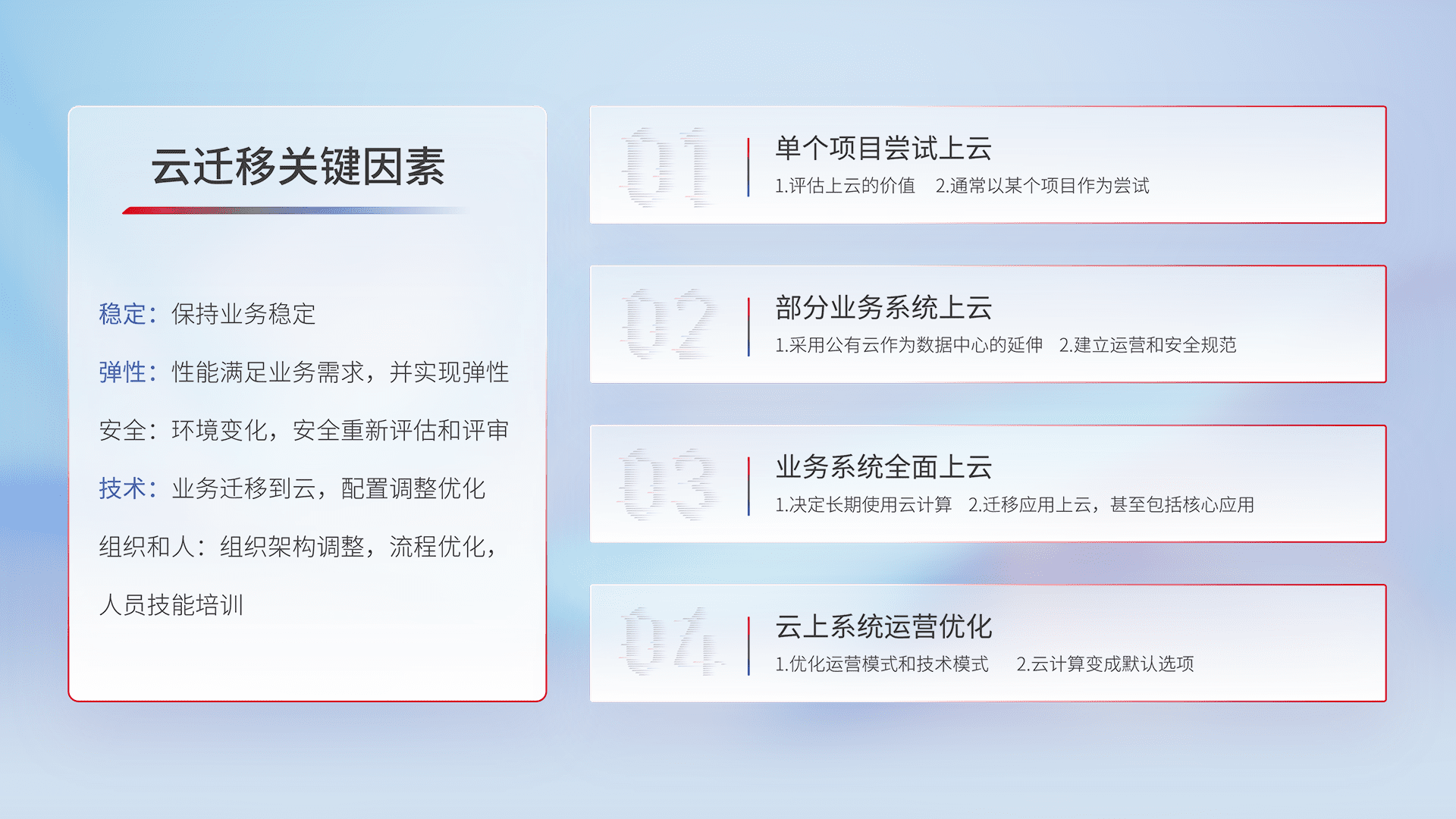 结合实际业务,,从规划设计、、、、云平台选型、、、云原生改造、、、数据迁移、、集成交付,,迁移全过程为客户识别最佳上云路径,,,做好风险识别管理,,,设计网络架构、、、、身份权限、、、、安全审计合规、、操作审计、、、日志审计、、、、监控告警策略、、多站点容灾设计等,,对云上基础设施进行整体规划,,,提升IT治理水平,,以满足弹性、、、、高可用、、高性能的需求。。