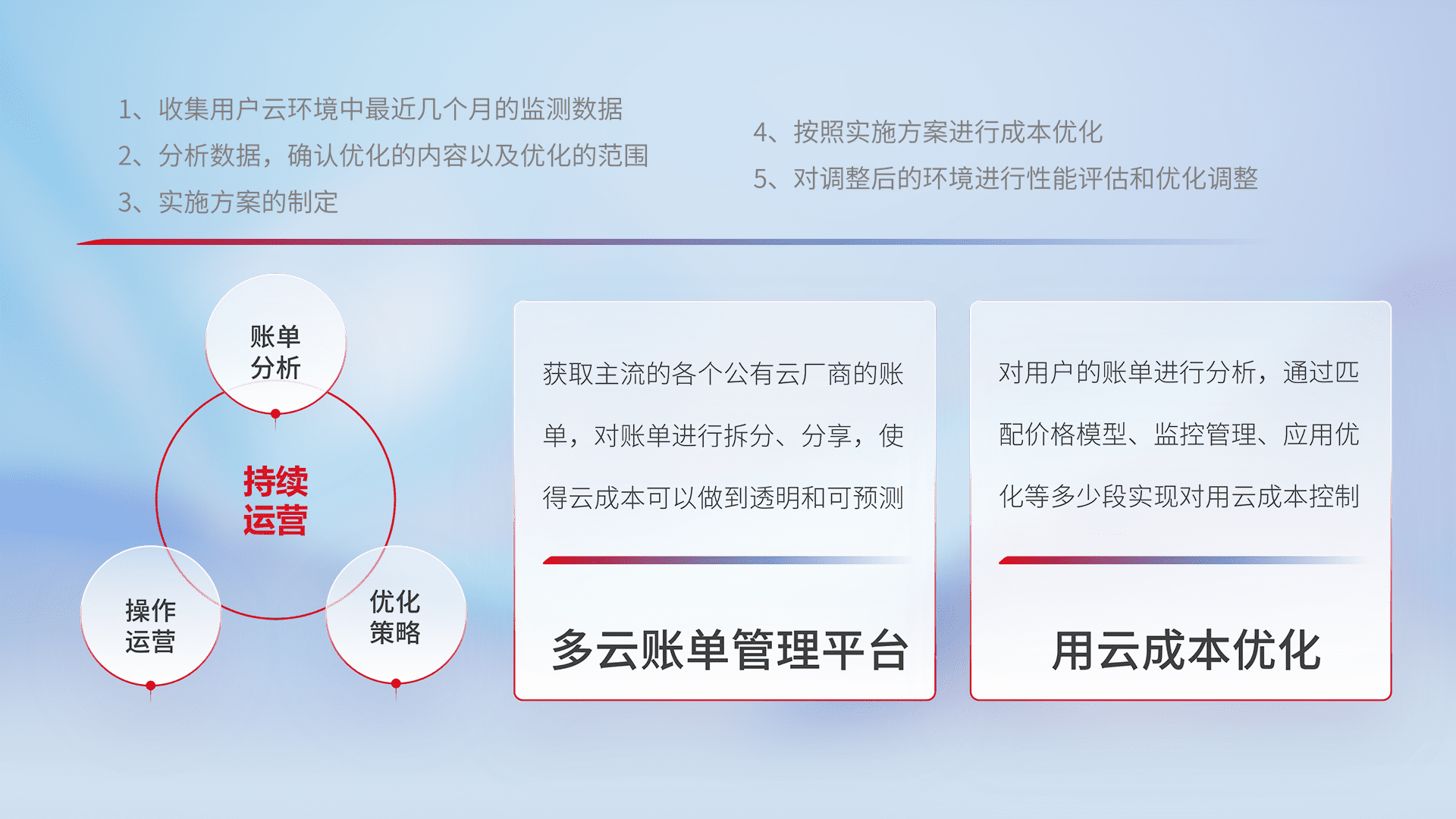 通过灵活运用多种自动化迁移工具,,,,帮助企业用户实现业务和数据高效 、、稳定的上云迁移和云上迁移,,,采用自研多云纳管平台,,,,以中立管理模式,,,,解决多组织、、、多云、、多运维厂商的复杂关系的管理,,,,保证多云平台资源配置的一致性,,,实时掌控云资源运行数据,,运用智能化工具分析云资源多云平台的管理服务,,,透明化管理成本支出,,用云成本可预测、、、用云费用可优化、、云资源配额有据可依。。