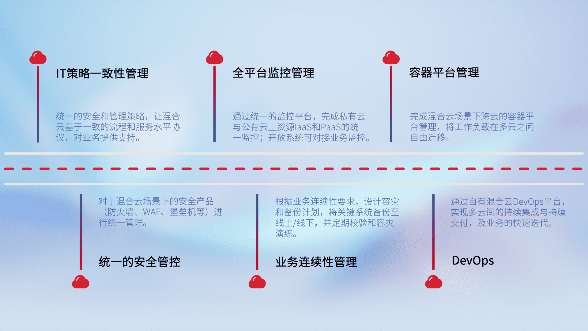 通过多云纳管,,,,以统一的资源数据模型把客户的云资源进行抽象和封装,,,进而实现对多云资源的统一操作,,保障云资源管理的可靠性、、、稳定性与可用性。。。。量身定制化运维内容,,,配置、、、、开发运维、、、、补丁管理、、备份、、监控、、、认证和访问管理、、、、审计和日常巡检等,,,,保障在用云过程中的可靠度,,稳定度以及高可用率。。。。