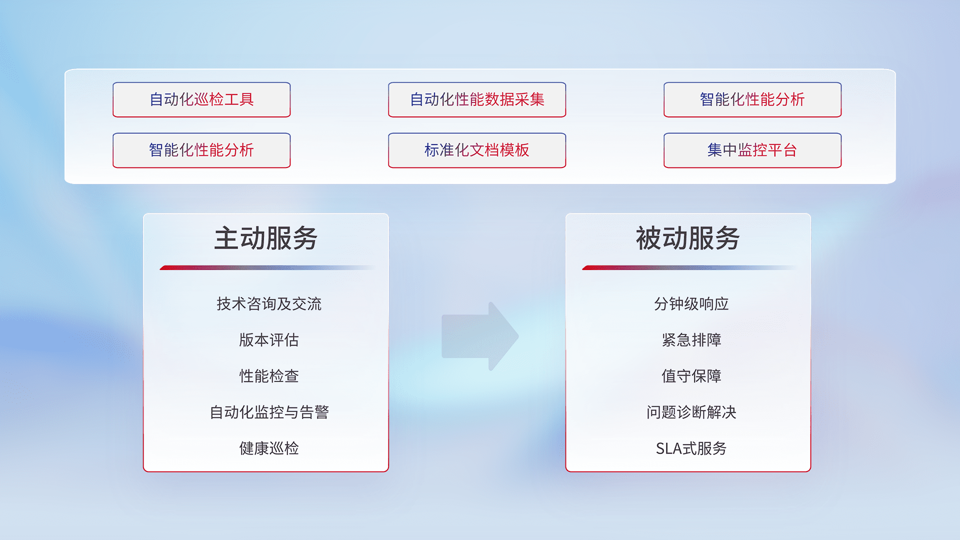 智能化工具和标准化文档,,,,保障服务质量,,,提供主动服务(包含技术咨询、、、、版本评估、、性能检查、、、、自动化监控与告警、、健康巡检)和被动服务包含(分钟级响应、、紧急排障、、、值守保障、、、问题诊断解决、、SLA服务)。。。